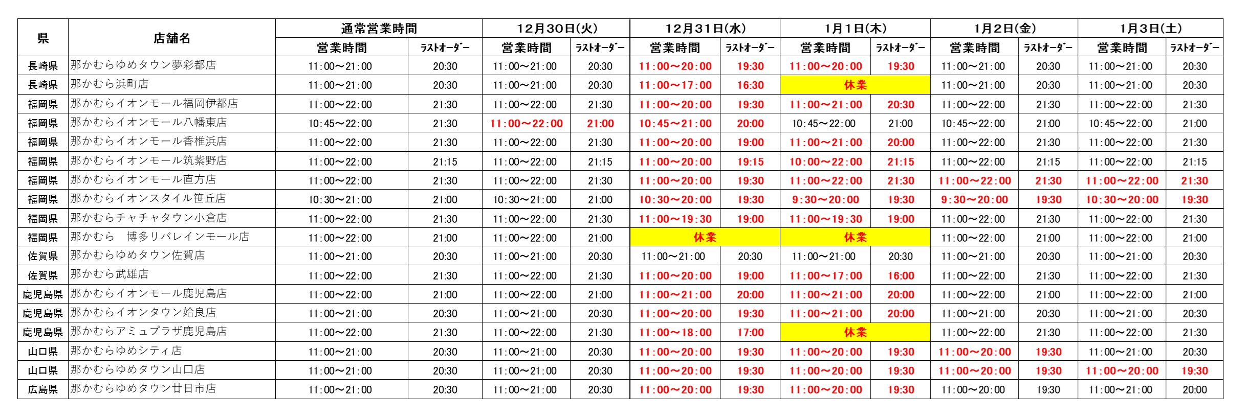 年末年始の各店の営業時間に関しては下記の通りとさせて頂きます。