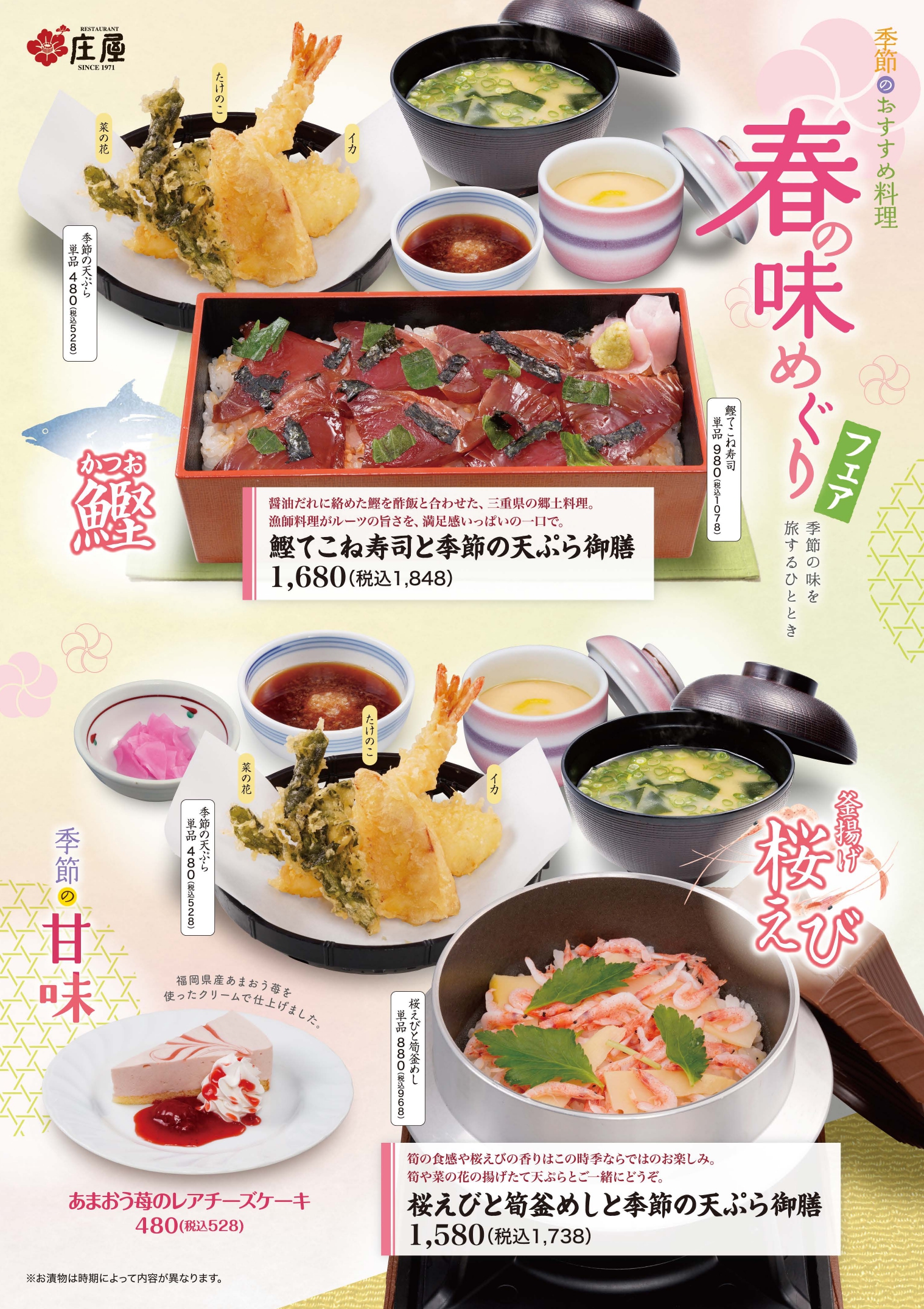 【3/4~5/10(予定)】春の味めぐりフェア開催中! 2026.03.04 お知らせ レストラン庄屋で春の味めぐりフェアを開催中です(5/10まで販売予定) 漁師料理がルーツの三重県の郷土料理「鰹てこね寿司」や春らしい風味と食感を味わえる「桜海老と筍の釜めし」を、菜の花や筍の「季節の天ぷら」と一緒にお楽しみください!あまおう苺のレアチーズケーキもおすすめです! 一覧へ戻る